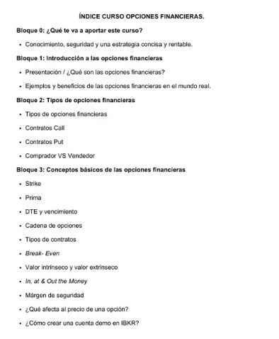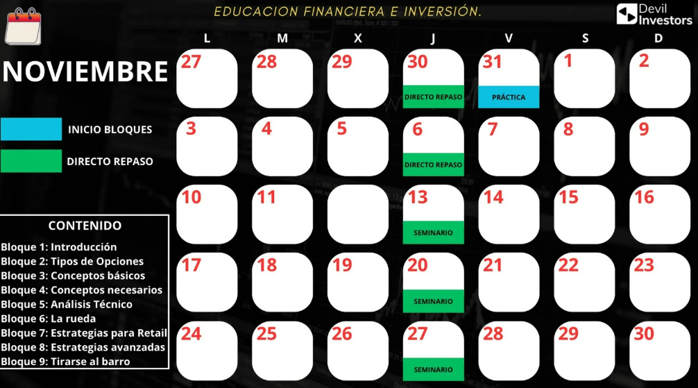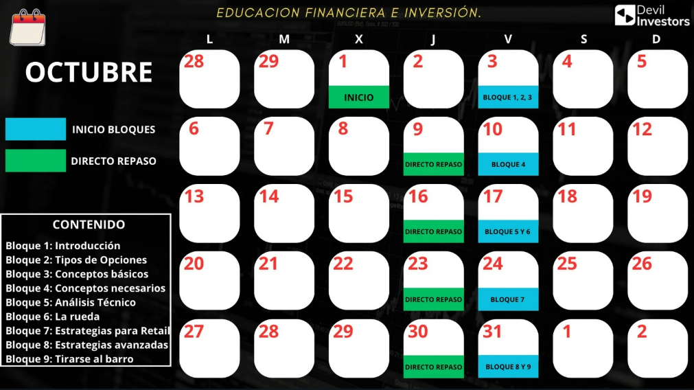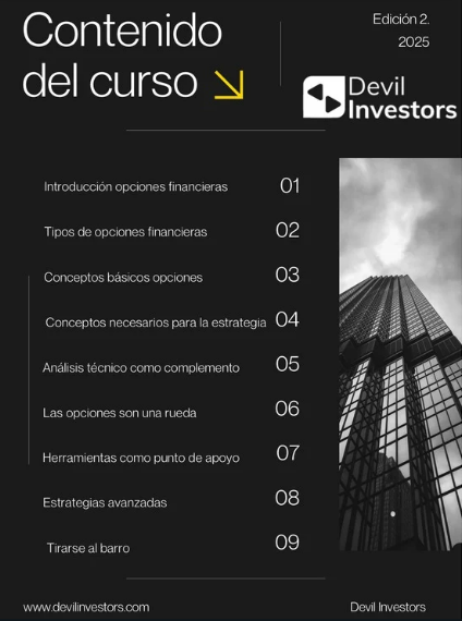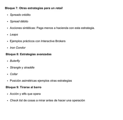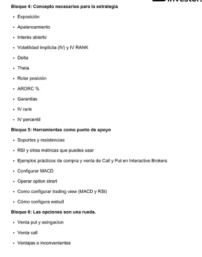 El camino para operar con opciones financieras de forma profesional empieza aquí. A través de 9 módulos diseñados para llevarte de un nivel básico a intermedio, te proporcionaremos las herramientas para tomar el control de tu capital. No solo tendrás acceso a diapositivas y documentos de estudio, sino también a exámenes prácticos y sesiones en vivo para reforzar cada concepto. Aprenderás las estrategias clave para generar rentas de forma recurrente, siempre con el conocimiento necesario para operar con confianza.